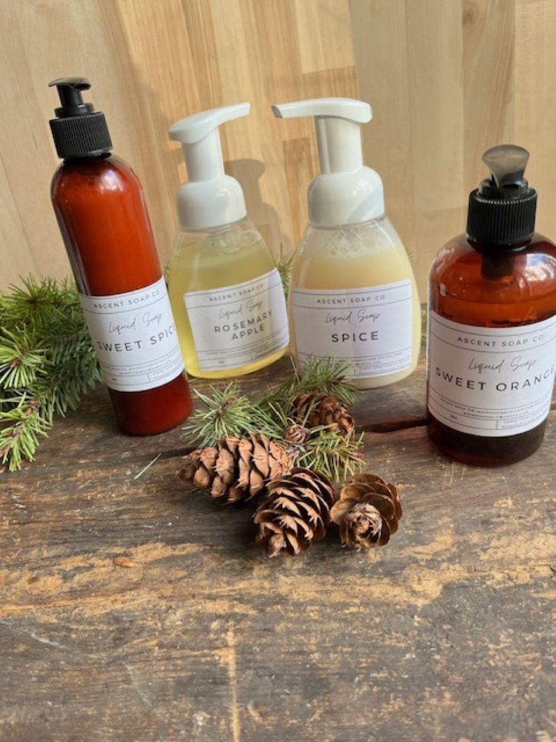 Ascent Soap Co. makes liquid soaps too! These soaps have wonderful bubbly lather, are super cleansers, and are incredibly gentle and non-drying. The soaps come in a variety of bottles - tall, short and foaming - and scents. If you have a favorite scent and it's not here - just email us for a special order! We are happy to work with you for your perfect bottle of liquid soap.